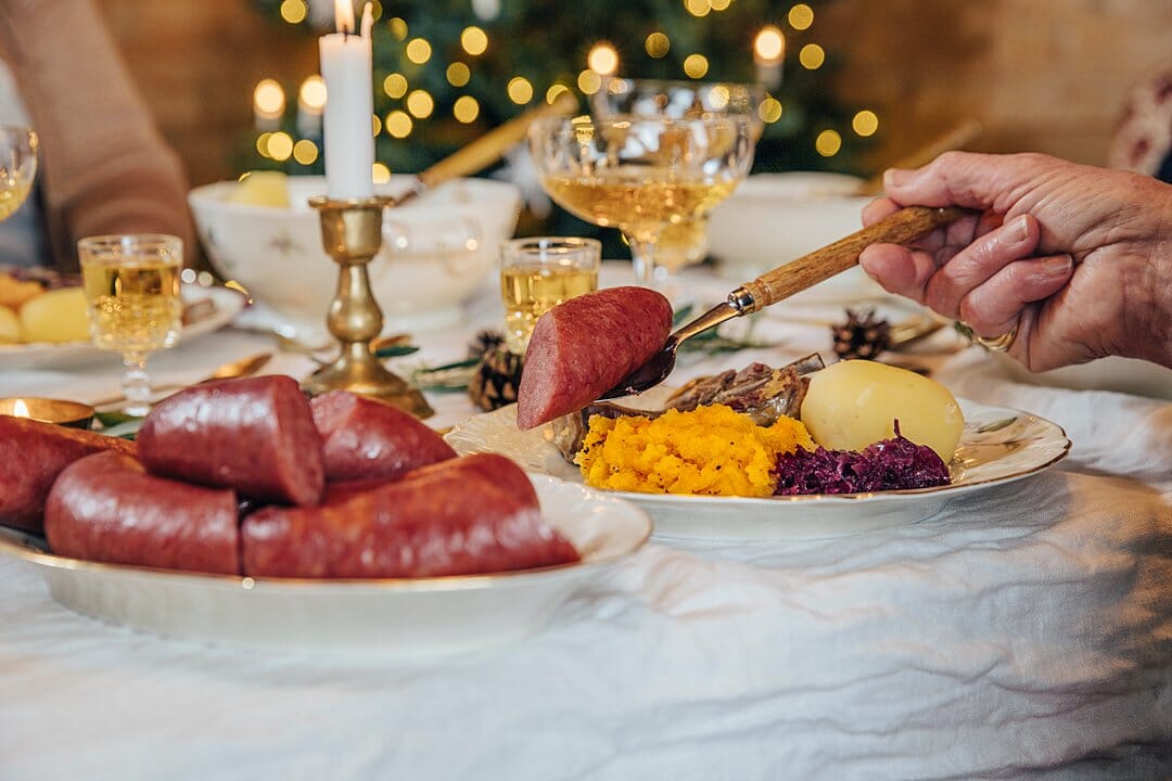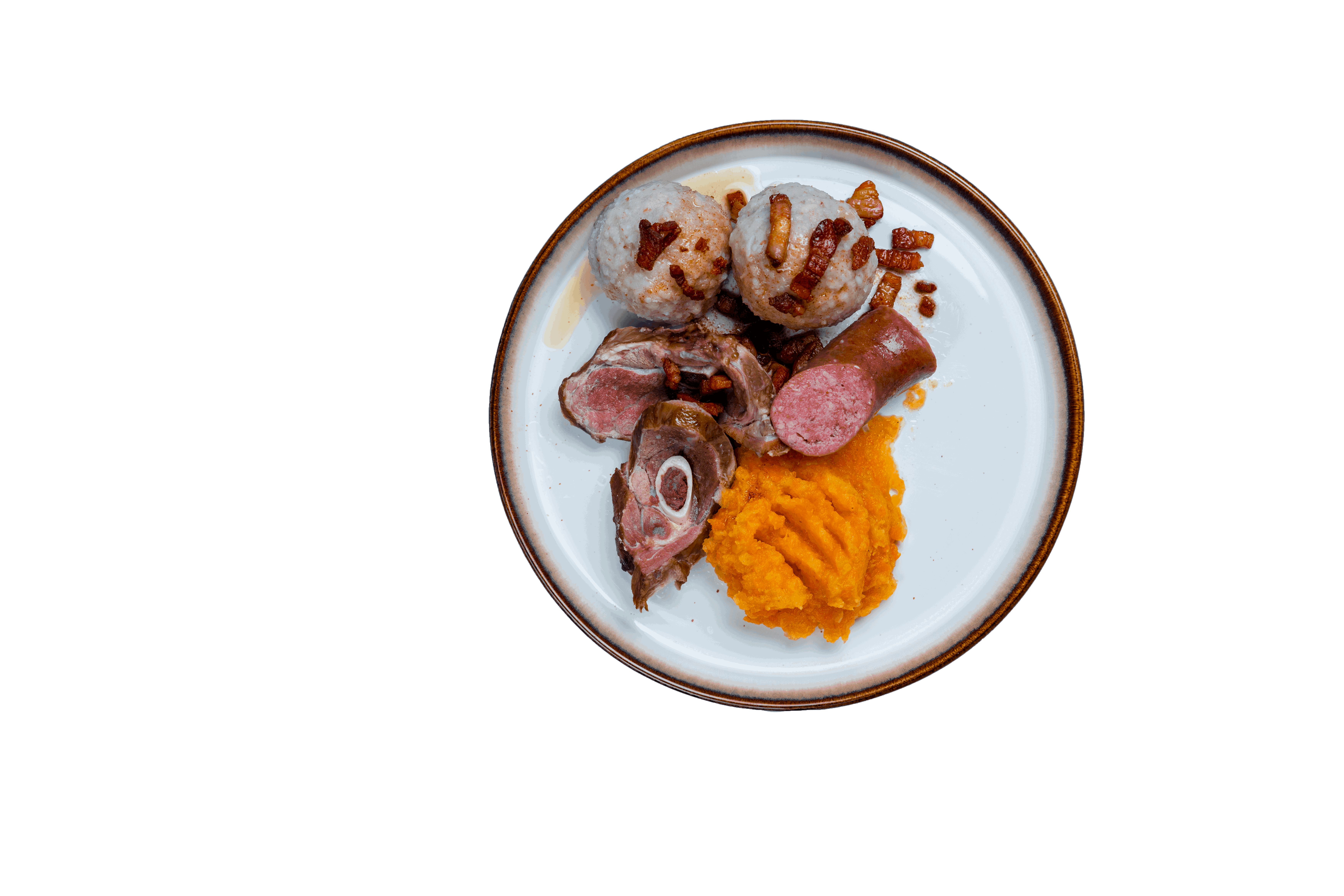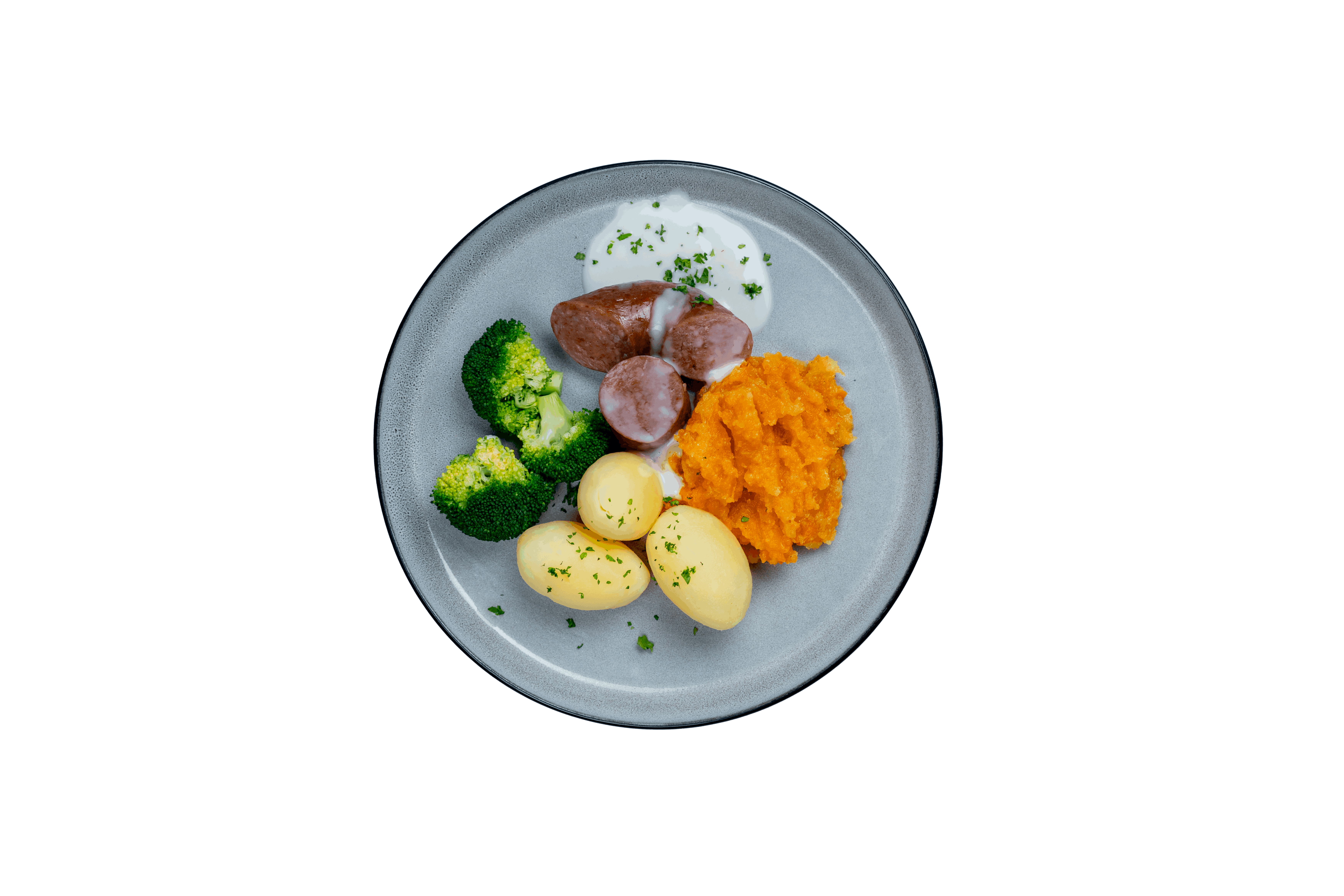 Ingrediensar: Kjøt (74%) av svin, storfe, fåre- og storfehjertekjøt, vatn, potetmjøl, salt og krydder. Tilsatt: Natriumsnitritt (E250). Ferdig kokt. Kjølevare: 0 - 4 grader. Vekt 0,335g. Fri for gluten og melketilsetningar.